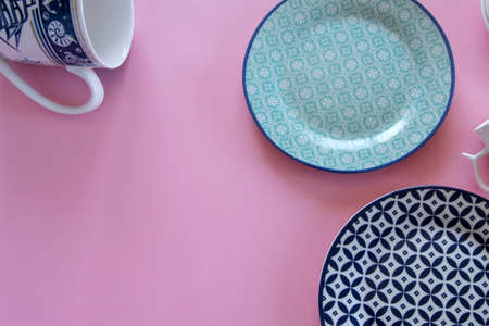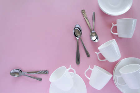 Overhead flat lay view of white clean tableware on pink background