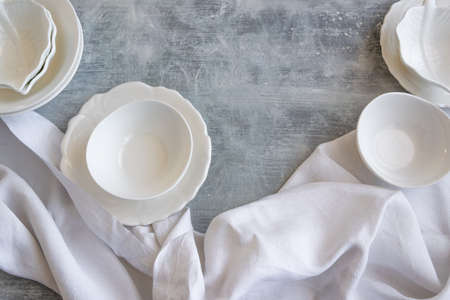Empty ceramic tableware. Ceramic plates on jeans tablecloth or runner. Overview empty food table with tableware. Set of different modern white plates and bowls.Top view or flat lay.Copy space for text