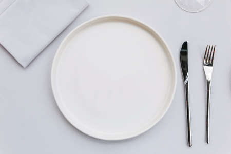 Top view of white empty plate on white tablecloth with knife, fork, napkin and wine glass.