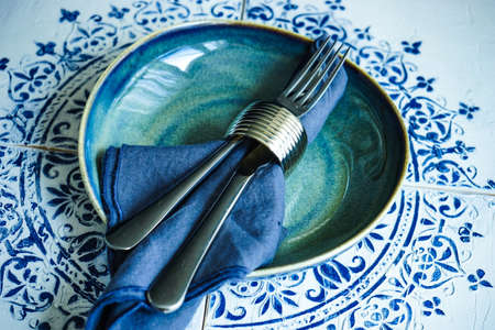Table served for dinner on moorish vintage tiles with copy space