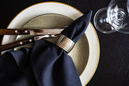 Rustic table setting with ceramic plates, napkin and silverware on dark wooden table