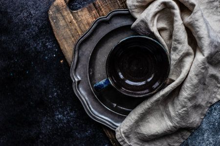 Top view of table setup on dark wooden background