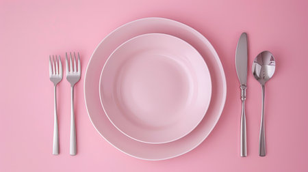 Polished silver utensils and pristine plate on pastel pink.
