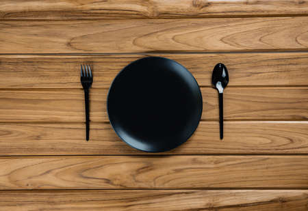 Top view of black empty round plate and tableware on marble stone background