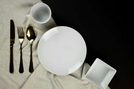 Empty black plate on the white table, serving for a gala meal top view