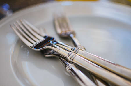 Silver forks on a white plate.