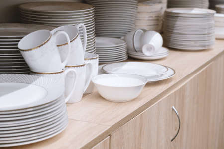 Close up of empty white ceramic tableware in restaurant. Selective focus.