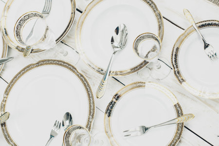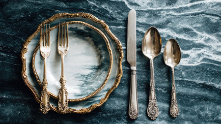 An overhead view displays a formal table setting. The composition features ornate plates, forks, knives, and spoons arranged on a textured surface. The image presents a vintage aesthetic with warm lighting, suggesting an indoor environment. This image is suitable for culinary, dining, or design-related projects.