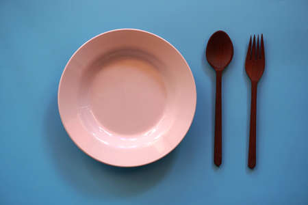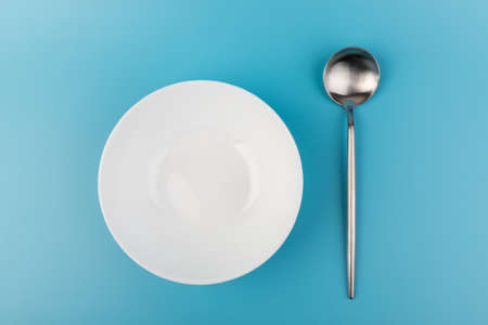 Empty plate with spoon on blue background. Top view. Kitchen Utensil.