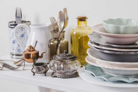 Buy old vintage romantic tableware in secondhand store concept. Pile of valuable old tableware on store shelf for kitchen.