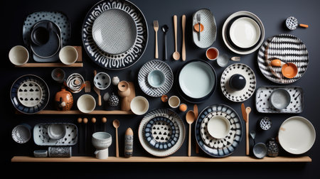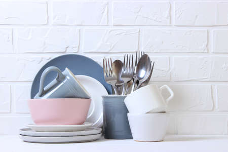 Set of dishes and kitchen utensils top view.