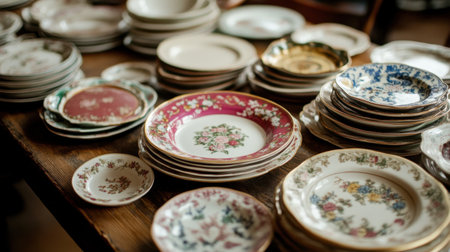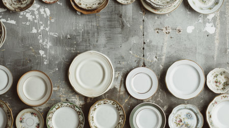 A captivating arrangement of vintage decorative plates on a rustic wooden surface. This image showcases beautiful textures and unique designs, perfect for various creative uses.