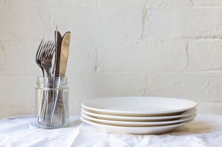 Four dinner plates and knives and forks in glass jar on white tablecloth against white brick wall