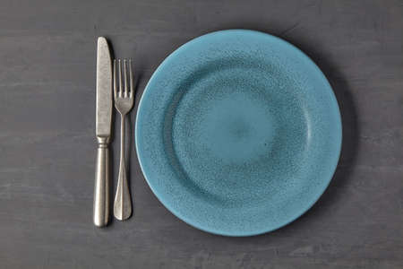 Blue plate on a dark concrete background with cutlery