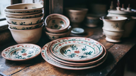 A collection of vintage hand-painted ceramics arranged in a cozy kitchen. The rustic bowls and plates feature beautiful floral designs, showcasing artistry and charm.