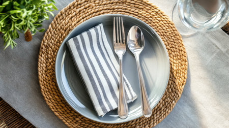 A beautiful table setting featuring a grey plate, polished cutlery, and a striped napkin on a woven placemat, creating a warm and inviting atmosphere for any meal.