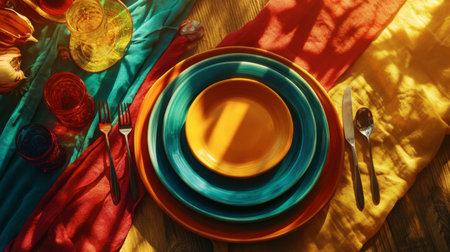 A vibrant table setting featuring colorful plates and glassware under natural sunlight. The warm colors and shadows create a cheerful atmosphere perfect for gatherings.