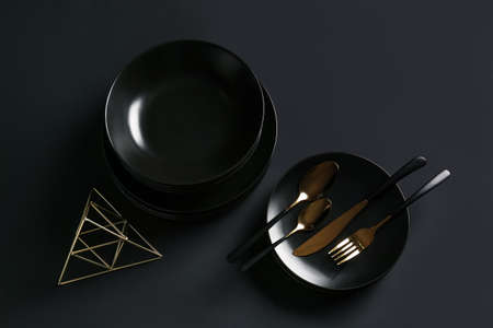 Stack of clean empty plates on black background, luxe dishware and table decor