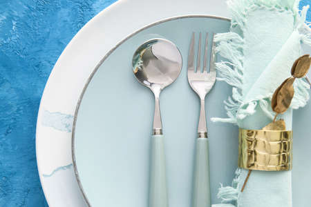 Set of beautiful dinnerware on blue grunge background