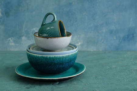Bright colorful table setting with multi-colored ceramic dishes in turquoise and yellow colors. Boho style.