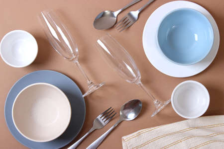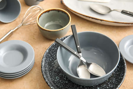 Set of dinnerware on beige table