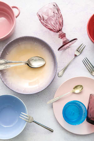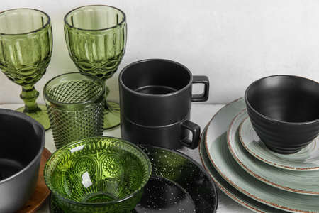 Different dinnerware on light table, closeup