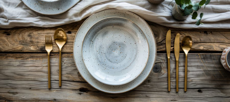 Modern Rustic Table Setting with Ceramic Plates and Gold Cutlery for Elegant Dining Decor