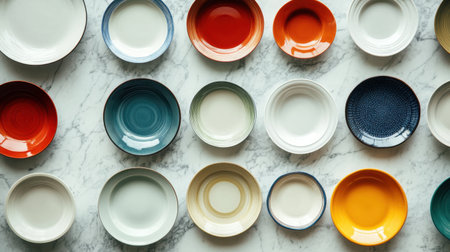 Discover a stunning display of colorful ceramic bowls and plates arranged neatly on a marble surface, perfect for various culinary and decorative inspirations in home settings.