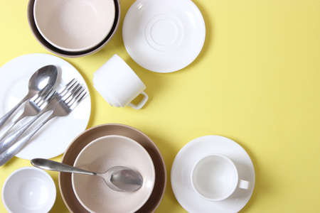 Dirty dishes with spoon and pork on yellow background. Top view