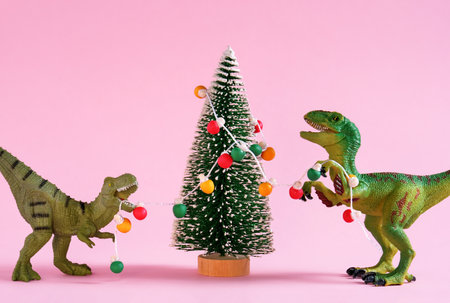 Happy cute green dinosaurs decorate Christmas tree with retro bulb garland. Christmas and new year greeting card on pastel pink background.