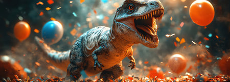 Dinosaur amidst a festive scene with colorful balloons, confetti, and banners, creating a lively party atmosphere