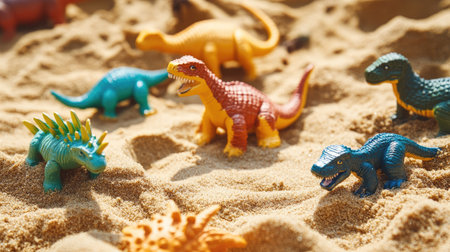 A child sandbox with toy dinosaurs partially buried, with space for text in the sand or sky area. )