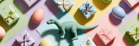 Brightly colored gifts with ribbons surround a cheerful toy dinosaur on a smooth pastel surface, creating a fun and festive atmosphere for children.
