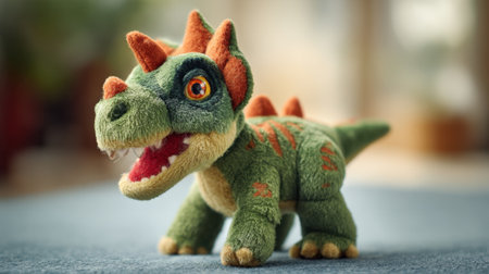 A cheerful dinosaur plush toy with vivid colors sits on a soft surface radiating warmth and charm.