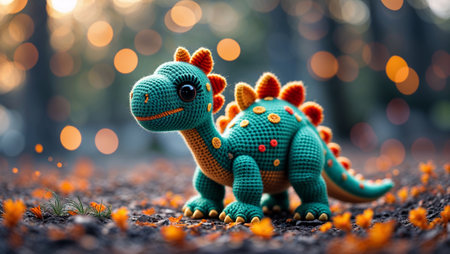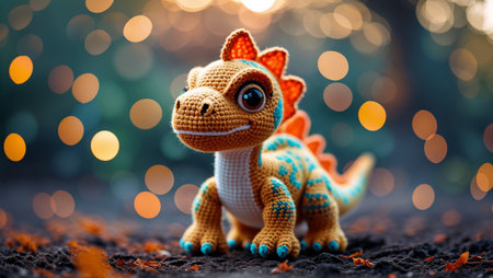 Small knitted dinosaur toy standing on a dark surface with bright bokeh lights in the background. Ai generated image
