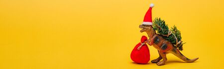 Toy dinosaur in santa hat with sack and fir on yellow background, panoramic shot