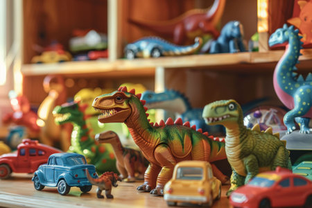 Colorful dinosaur toy in a playful setting with miniature cars on a wooden shelf