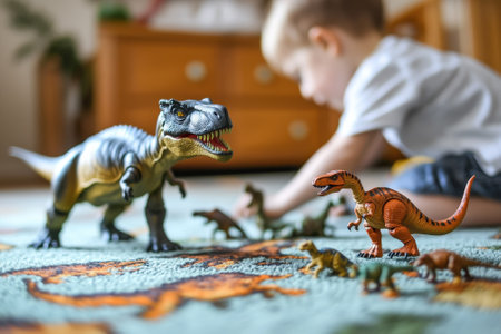 A young child engages in imaginative play with various dinosaur toys on a vibrant rug, enjoying the activity.