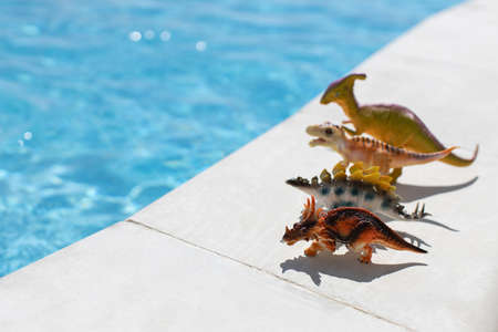 Four small toy dinosaurs stand in row near swimming pool on bright sunny day, copy space. Concept of summer vacation, childhood, togetherness, sunbathing, health. Side view. Soft focus. Horizontal.