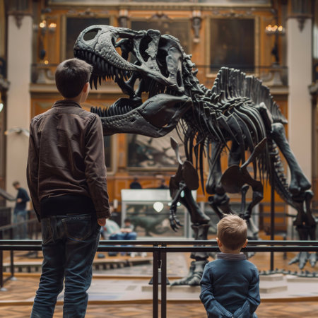 Dad and boy watching dinosaur skeleton in museum, generative ai illustration