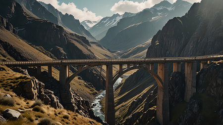A bridge arches over a calm river, bathed in the soft light of dusk with mountains looming in the distance. The setting sun filters through, creating a serene atmosphere around the sturdy structure. AI generation