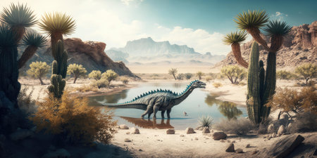 Prehistoric creature or dinosaur in the wild nature. Realistic style drawing. superlative generative AI image.