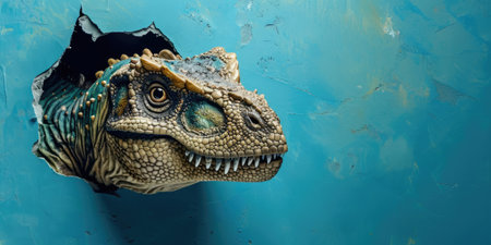 Close up view picture of the hollow blue hole on the the wall that show the t.rex stay inside the wall that has been made from some material yet still can break to look through the other side. AIGX03.