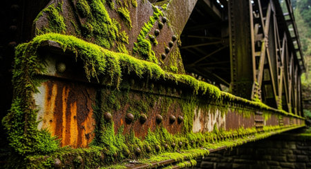 A weathered metal bridge stands in ruins, overtaken by nature's elements in a dry riverbed. Crumbling concrete and twisted metal illustrate the passage of time and forgotten journeys.