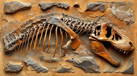 A captivating dinosaur fossil skeleton rests on a textured stone surface, showcasing the unique bone structure and sparking curiosity in paleontological research.