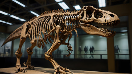 A captivating display of a T-Rex skeleton in a museum gallery, showcasing its impressive bones and providing a glimpse into prehistoric life. Ideal for educational and cultural themes.