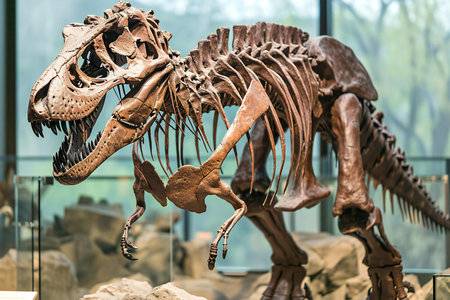 Tyrannosaurus rex skeleton exhibit in a museum, showcasing the fossilized remains of the legendary dinosaur in detail