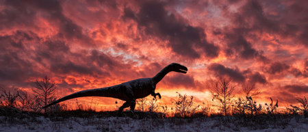 A dinosaur is walking across a field with a cloudy sky in the background. Scene is mysterious and ominous, as the dinosaur is a creature that has long been extinct. The field is barren and desolate