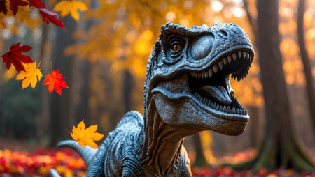 AI Generated. Lifelike dinosaur statue roars amidst a backdrop of autumn foliage