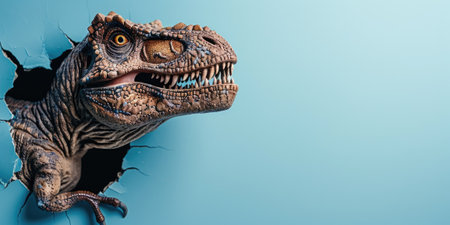 Close up view picture of the hollow blue hole on the the wall that show the t.rex stay inside the wall that has been made from some material yet still can break to look through the other side. AIGX03.